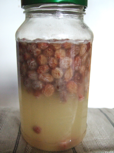 4日目、どれくらいのガスが発生しているのか気になったので、ちょっとの間だけ、ふたを完全に閉めてみました。数時間後、ふたをひねった瞬間にポンッというかプシュというか、あの、ビール瓶を開けたときのような音がして、手にも気泡の感触をうけました。「おぉ~、すごい、すごい!」と嬉しかったです。元気に育ってくれているみたいですね。そして、必要なかったかもしれないけれど、水を足してみました。放っておくことができず、何か、こう、手を加えたくなっちゃうんですよね。香りはかなり強くなり、酔っぱらいそうな感じです。